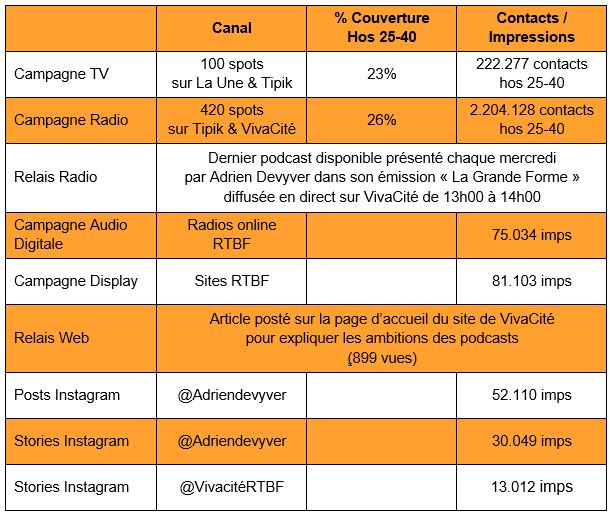 Avec l’accord d’Adrien Devyver, qui est au centre de l’ensemble de la campagne, l’équipe F.L.A.S.H. a activé les meilleures techniques du Celebrity Marketing. L’animateur est lui-même l’ambassadeur des podcasts « Moi, papa » : il est l’acteur principal des spots radio-TV et digitaux, il est présent dans tous les formats display, il anime les conversations à propos des podcasts sur son propre compte Instagram, etc.