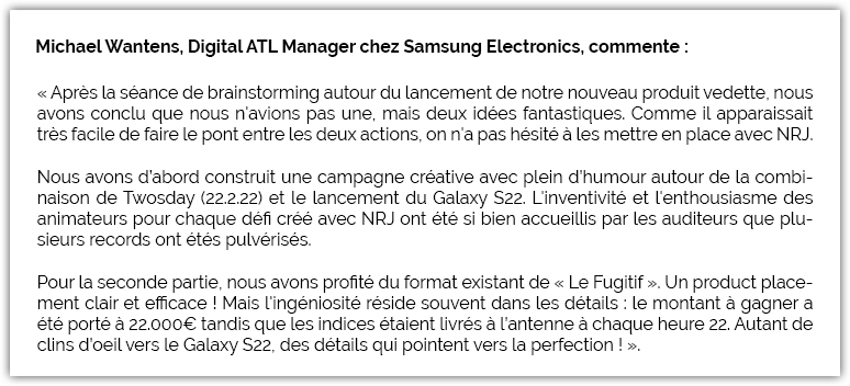 Le 22 février 2022 a été le point d’orgue de cette 1ère campagne. C’est à cette date, tout spécialement choisie en raison de sa capacité naturelle à renforcer le lien avec la marque Galaxy S22, que Samsung a offert vingt-deux nouveaux smartphones à l’antenne de NRJ au terme d’un concours largement annoncé en amont.