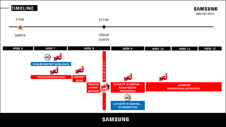 Suite au brainstorming entre Samsung, son agence Space, la BU Sales Nationale et l’équipe créative de RMB, deux opérations sont lancées en collaboration avec NRJ et AB3. Ce choix média s’impose naturellement en raison de la cible de l’annonceur qui cherche principalement à s’adresser aux 18-34 ans.