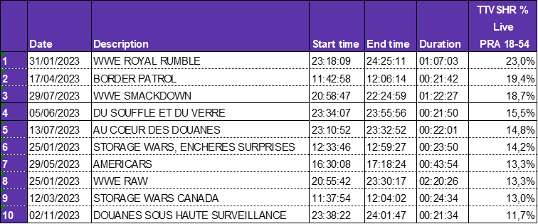 TOP 10 (meilleurs programmes 2023 en TTVshr% sur les PRA 18-54)