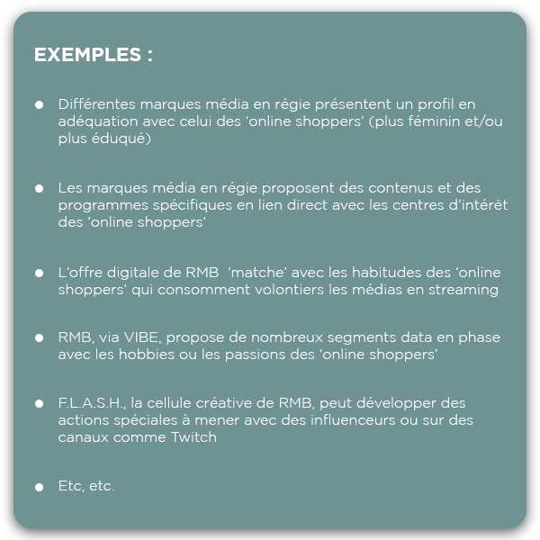 RMB propose une panoplie de solutions média et/ou data qui permettent de toucher efficacement les ‘online shoppers’. Ces solutions se déploient tant dans les médias linéaires en régie qu’au niveau de l’offre digitale de RMB :