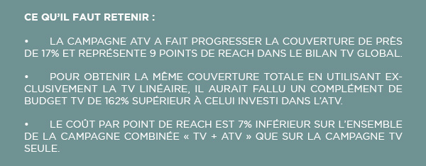Le POC Solo démontre que l’ATV offre de nouvelles opportunités d’optimisation des plans TV et que cette nouvelle solution publicitaire comble parfaitement les attentes des annonceurs en termes d’incremental reach.
