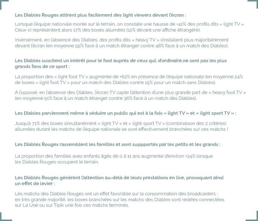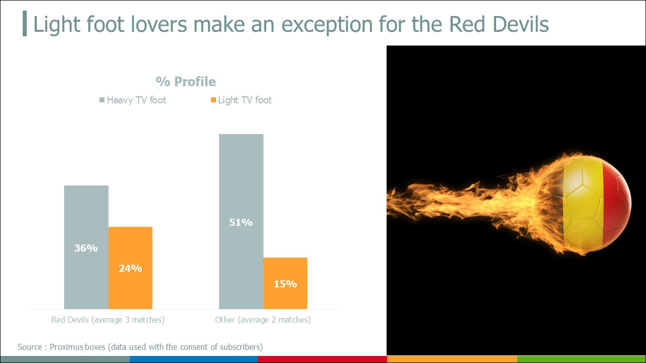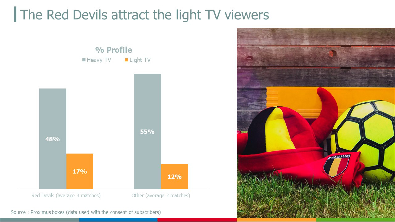 De façon très globale, comme on peut aussi l’observer dans l’Audimétrie, les matchs des Diables Rouges sont les matchs les plus regardés. Les insights les plus intéressants concernent le profil des téléspectateurs (clients boxes Proximus). Des différences significatives ressortent de la comparaison établie entre les matchs disputés par les Diables et les autres matchs. De toute évidence, notre équipe nationale exerce un important pouvoir d’attraction mesuré, entre autres, au travers de 5 observations :