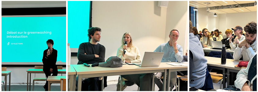 Auprès de Valérie, Maxime Van Der Meerschen (co-fondateur de GiveActions) et Sébastien Snoeck (Audience Insights Campaigner chez Greenpeace Belgium) étaient également présents pour alimenter le débat et répondre aux questions des étudiants.
