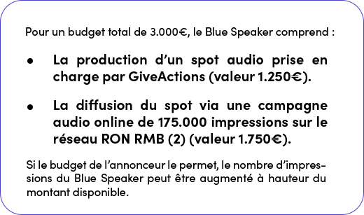 Dans le but de permettre à tous les acteurs de la transition écologique et sociale d’accéder à plus de visibilité dans les médias, RMB et GiveActions lancent ensemble le ‘Blue Speaker’, une nouvelle offre publicitaire qui combine à moindre budget la production d’un spot audio avec une campagne sur le réseau des marques digitales en régie chez RMB.