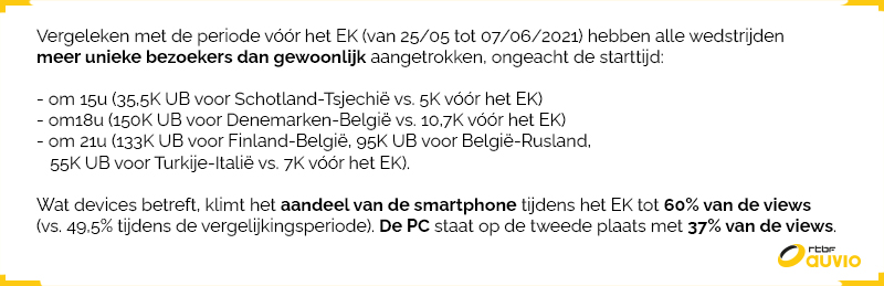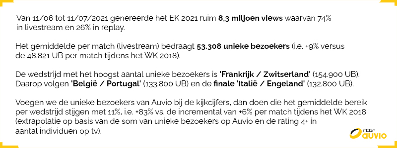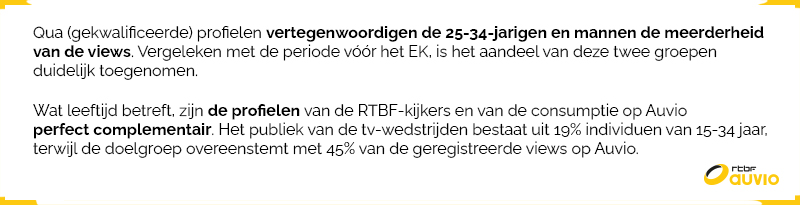 VIBE onderzocht bovendien ook de data die de RTBF via Auvio heeft verzameld. Dankzij de exploitatie van de geaggregeerde digitale database van onze partner, kan ons Data & Insights-team een ander licht werpen op de impact van het EK 2021 op de digitale performances van de RTBF.