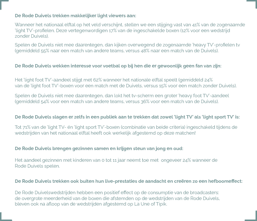 Over het algemeen, en zoals ook blijkt uit de Audimetrie, zijn de wedstrijden van de Rode Duivels het best bekeken. De interessantste insights zijn die over het profiel van de kijkers (Proximus TV-Box klanten). Bij het vergelijken van de Rode Duivelswedstrijden met de andere wedstrijden, komen er belangrijke verschillen naar voren. Het spreekt vanzelf dat ons nationaal elftal een grote aantrekkingskracht heeft, die onder meer gemeten werd aan de hand van vijf observaties: