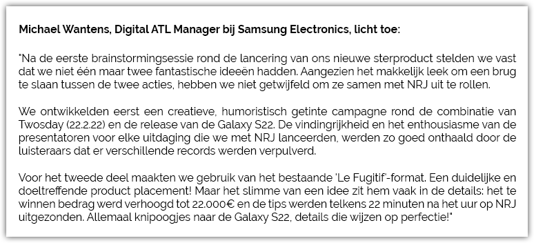 De toegevoegde waarde van de Samsung-case zit in de geplande opeenvolging van de twee acties die met NRJ werden uitgerold: