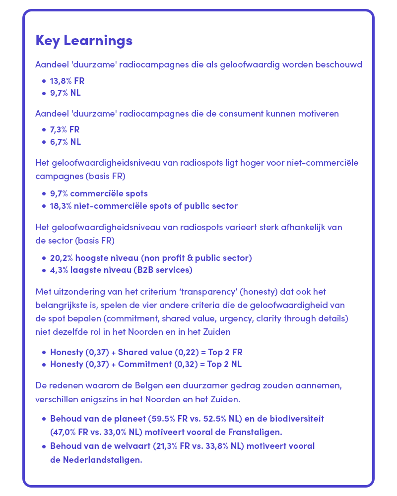 RMB deelt de resultaten van het benchmarkonderzoek dat de regie - samen met haar mediapartners NRJ, RTBF en LN Radio - uitvoerde over de geloofwaardigheid van 'duurzame' radiocampagnes. Het RMB-onderzoek, geleid door Bubka, is complementair aan het onderzoek dat de Var begin dit jaar over hetzelfde onderwerp liet uitvoeren. Aangezien het RMB-onderzoek gebaseerd is op hetzelfde model, is het mogelijk om de analyse uit te breiden op nationaal niveau en Noord-Zuid-vergelijkingen te maken. RMB nodigt adverteerders en reclamebureaus nu uit om, op basis van de bevindingen, samen te werken en zo de communicatie van duurzame merken te verbeteren!