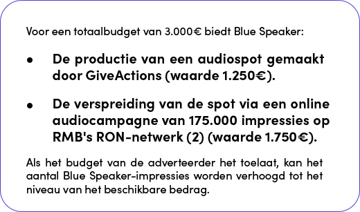 Om alle spelers die betrokken zijn bij de ecologische en sociale transitie toegang te bieden tot meer mediazichtbaarheid, lanceren RMB en GiveActions samen ‘Blue Speaker’, een nieuw reclame-aanbod dat voor een beperkter budget de productie van een audiospot combineert met een campagne op de digitale merken in regie bij RMB.